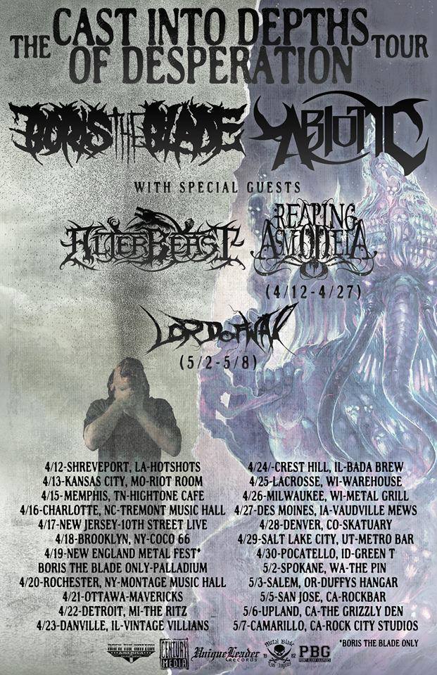 Boris The Blade and Abiotic will co-headline ‘The Cast Into Depths Of Desperation Tour‘. Alterbeast will also appear with Reaping Asmodeia joining from 04/12-04/27 and Lord Of War appearing from 05/02-05/08.