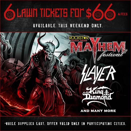 This coming weekend only, get 6 ROCKSTAR ENERGY DRINK MAYHEM FESTIVAL general admission lawn tickets for you and your friends for just $66 (plus fees) from June 5th at 10:00am local time through June 7th at 10:00pm local time, and while supplies last.