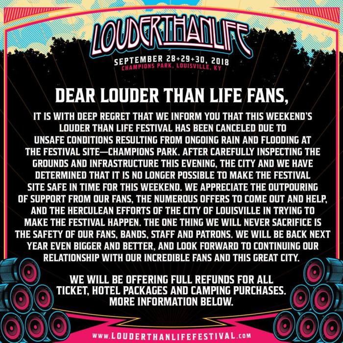 It is with deep regret that we inform you that this weekend’s Louder Than Life festival has been canceled due to unsafe conditions resulting from ongoing rain and flooding at the festival site—Champions Park. After carefully inspecting the grounds and infrastructure this evening, the City and we have determined that it is no longer possible to make the festival site safe in time for this weekend.