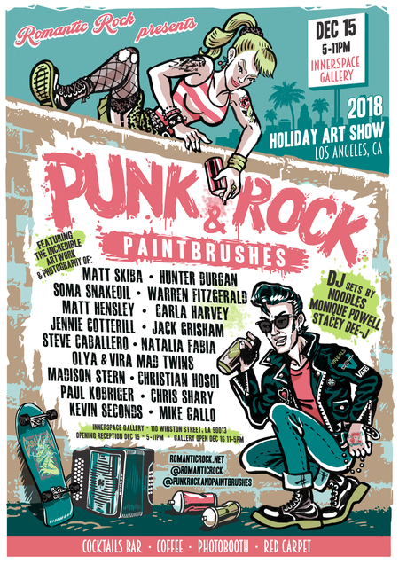 The Innerspace Gallery is located in downtown Los Angeles at 110 Winston Street, Los Angeles, CA 90013. The Punk Rock & Paintbrushes group art exhibition will also be open on Sunday, December 16 from 11:00 a.m. – 6:00 p.m.